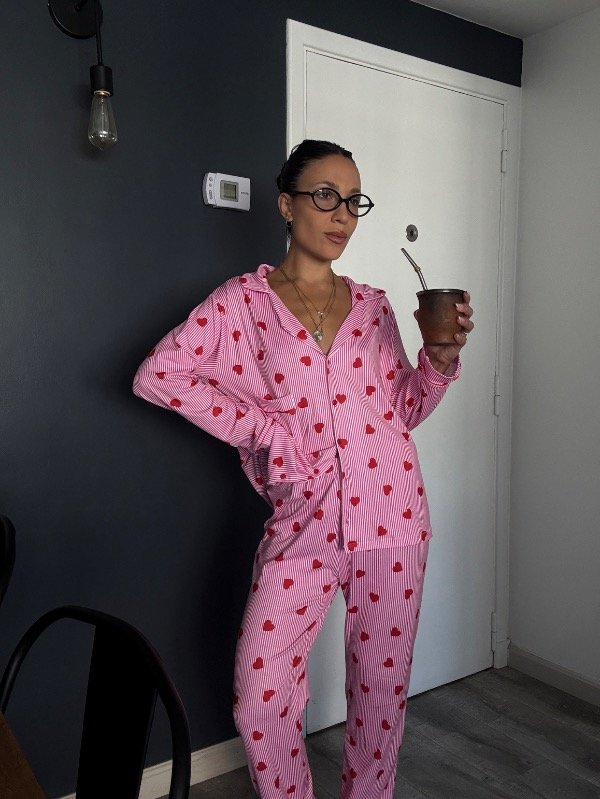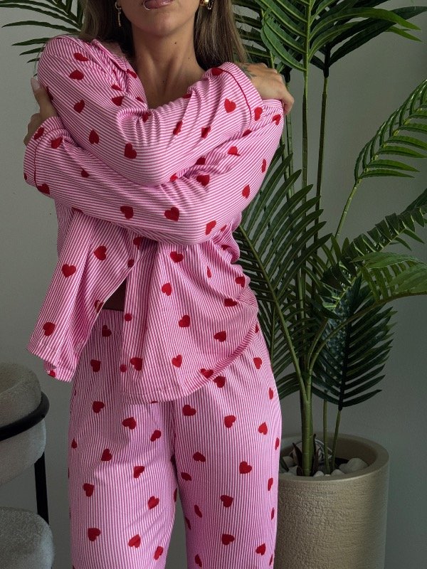 PIJAMA CAMISERO ESTAMPADO RAYAS Y CORAZONES / PRE-SAVE
